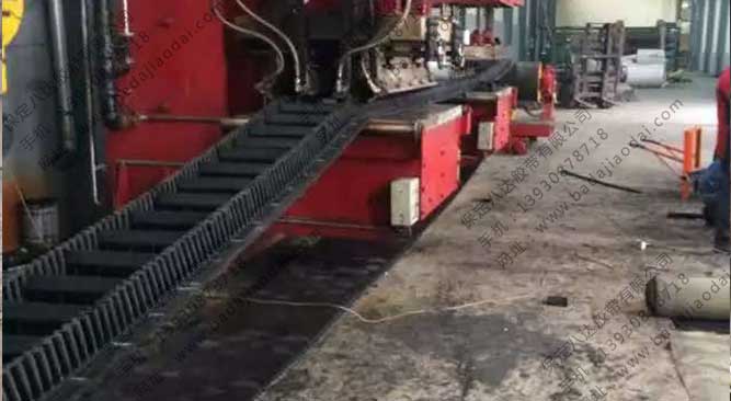 大傾角輸送帶損傷原因輸送帶使用有一定的期限,長(zhǎng)期使用或者不正當(dāng)?shù)氖褂枚紩?huì)對(duì)輸送帶造成損害,八達(dá)膠帶有限公司總結(jié)了大傾角擋邊輸送帶損傷的八大原因:1.擋板長(zhǎng)度不足所致,應(yīng)將擋板長(zhǎng)度調(diào)整放長(zhǎng),直到輸送帶上的物料穩(wěn)定為止。2.裙邊開檔不合適所致。裙邊開檔應(yīng)該是輸送帶寬度的2/3—3/4,塊狀物料時(shí)應(yīng)窄一些。裙邊好呈扇形(開口順著運(yùn)行方向),并能調(diào)整開度大小。3.輸送帶和擋板的間隔不合適。先把擋板的輸送帶運(yùn)行方向一側(cè)與輸送帶相觸,之后慢慢加大間隔到適當(dāng)位置,以減少擋板對(duì)輸送帶的磨損。4.投料方向不合適,即物料落下的方向與輸送帶運(yùn)行方向不同,以致產(chǎn)生橫向力,使輸送帶跑偏或受磨損加劇,應(yīng)調(diào)整落料方向。5.擋板的材質(zhì)不合適。擋板材質(zhì)過硬,或者使用舊輸送帶而帆布露出,以致直接與輸送帶接觸,應(yīng)選用合適的橡膠擋板。6.物料的落料角度和落差不合適所致。應(yīng)減少角度,使物料落在輸送帶上不彈跳。落差大而輸送帶受到很大沖擊時(shí),應(yīng)采取措施,以降低投料時(shí)的速度7.物料的落料速度不對(duì)所致,由于物料的落料速度和輸送帶的速度調(diào)整得不好,物料落在輸送帶上的瞬間打滑,由此磨損上蓋膠時(shí),要調(diào)整落料速度,使之與輸送帶速度一致。8.下托輥粘有物,不轉(zhuǎn)動(dòng)或沒調(diào)整好,上蓋膠異常磨損,應(yīng)采取如下幾種方法:安裝清掃器、清洗輸送帶、在返回輥上安裝橡皮套、修理或更換返回輥。