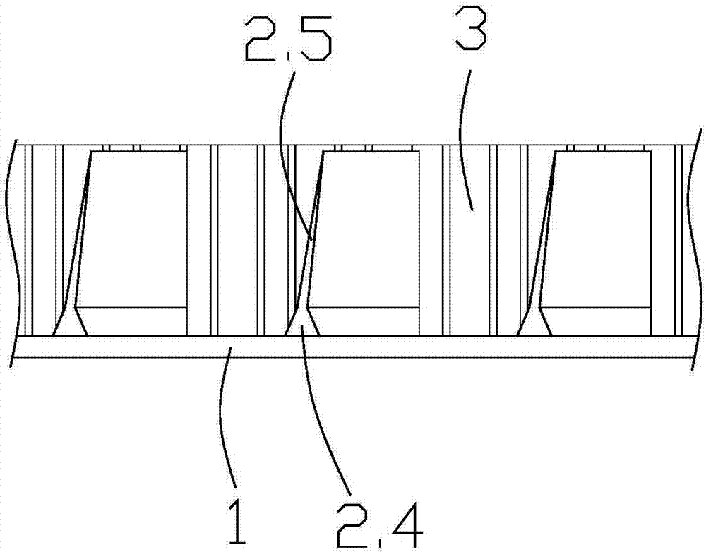 由于帶體1自后向前逐漸向上傾斜,隔斷2相對于帶體1表面向前側(cè)傾斜設(shè)置,隔斷2形成的容納槽2.3的寬度自由向前逐漸增大。
