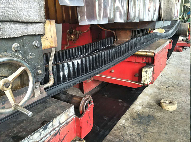 大傾角輸送帶工作時(shí),通過(guò)電機(jī)、減速機(jī)帶動(dòng)皮帶,起到物料輸送的作用。在電機(jī)、減速機(jī)帶動(dòng)皮帶運(yùn)行輸送物料的同時(shí)其它輔助設(shè)備如尾部滾筒,壓輪及皮帶托輥也開始轉(zhuǎn)動(dòng),皮帶中的粘有一定強(qiáng)度和彈性的橫隔板組成的斗子通過(guò)不停地轉(zhuǎn)動(dòng)裝載物料,斗子卸完料后經(jīng)過(guò)拍打清掃器對(duì)斗子進(jìn)行拍打清理后,使斗子里面粘結(jié)的物料脫落,在不停的轉(zhuǎn)動(dòng)中斗子重復(fù)著裝料卸料的工作。