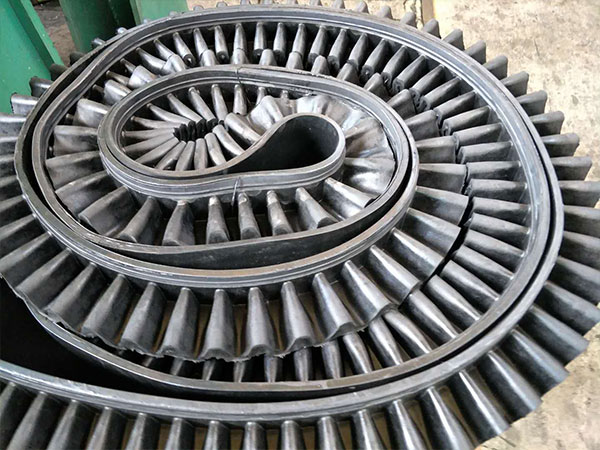 大傾角輸送帶超過70度角應(yīng)采用覆蓋帶,使用覆蓋帶的好處防止漏料對(duì)基帶造成損傷;同時(shí)也能增加物料的運(yùn)量。在選擇隔板裙邊時(shí)應(yīng)先考慮輸送機(jī)的輸送量,如:裙邊高度、隔板間距大小、有效帶寬的大小。