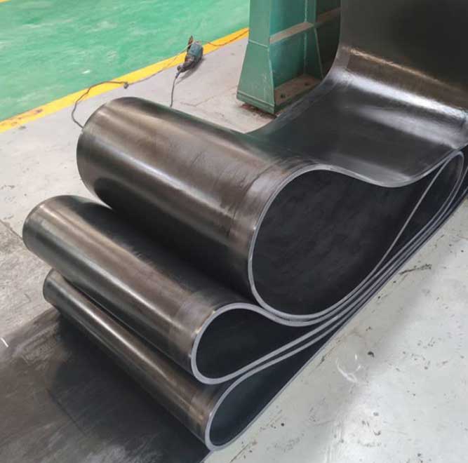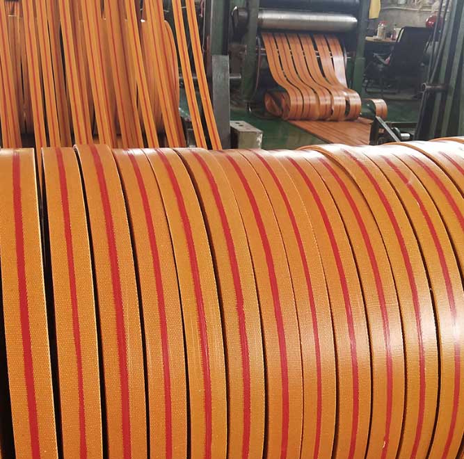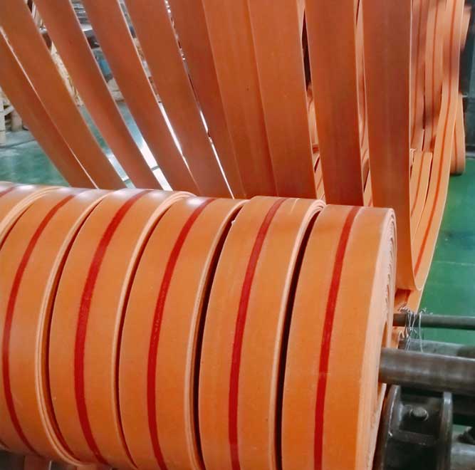 橡膠前進(jìn)帶由多層掛膠織物疊包而成,帶芯外一般應(yīng)有掩蓋膠。依據(jù)運(yùn)用溫度的不同分為耐熱前進(jìn)帶和一般前進(jìn)帶;依據(jù)帶芯材料的不同分為全棉、滌棉交織、尼龍和EP前進(jìn)帶。