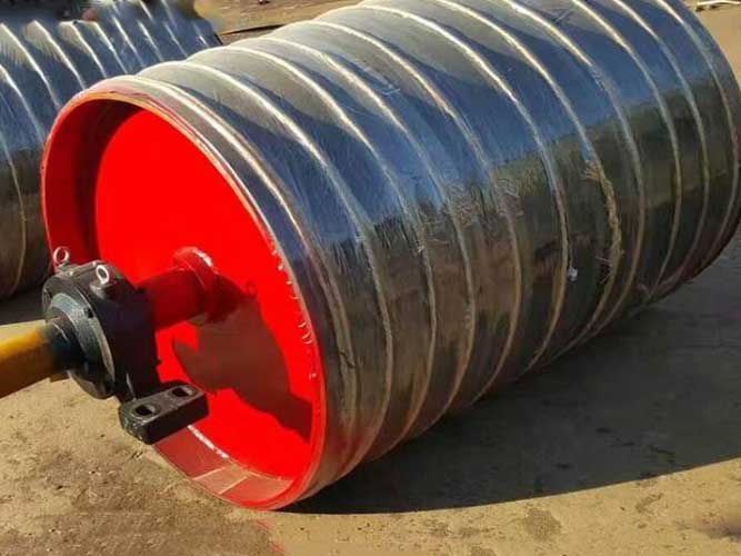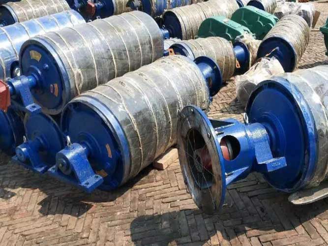 當(dāng)驅(qū)動裝置運(yùn)轉(zhuǎn)時(shí),驅(qū)動裝置中的扭矩傳送到傳動滾筒軸上,再由軸通過內(nèi)部脹套(或者鍵)連接進(jìn)而把扭矩傳送到筒體上,由于滾筒與皮帶之間的摩擦力,后將扭矩傳送到皮帶上帶動整條皮帶輸送機(jī)的運(yùn)轉(zhuǎn)。